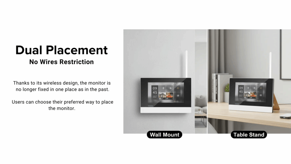 Wall-mounted and desktop-standing options available. Wall-mounted design saves space and is more concealed, suitable for home entrances, walls and storefronts. Desktop-standing design can be freely placed in foyers, living rooms or shop receptions, easy to move. Perfect for small apartments, large courtyards and commercial stores.